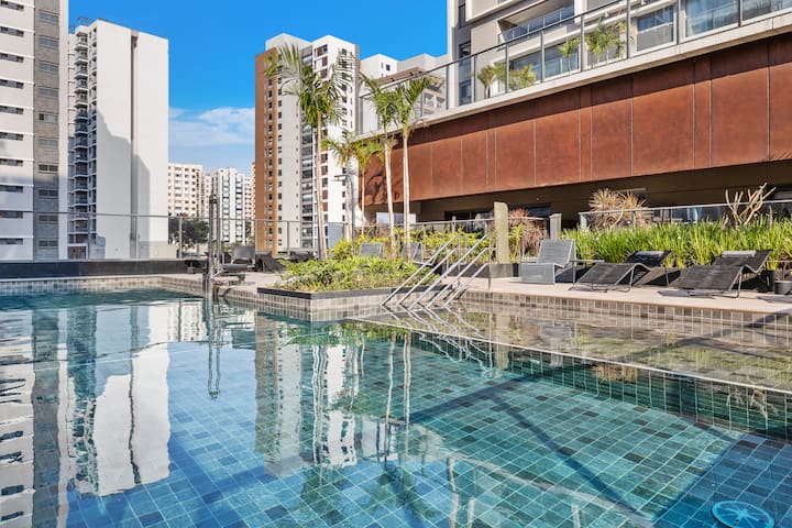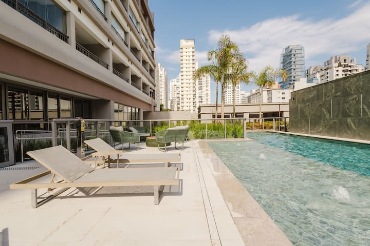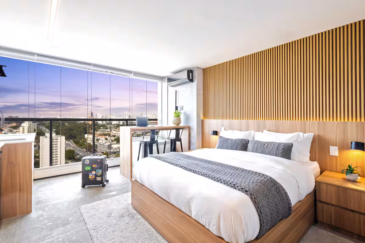 From the 18th floor of Moema, São Paulo unfolds beneath you — Ibirapuera Park on the horizon, world-class restaurants below, and a skyline view that never gets old.