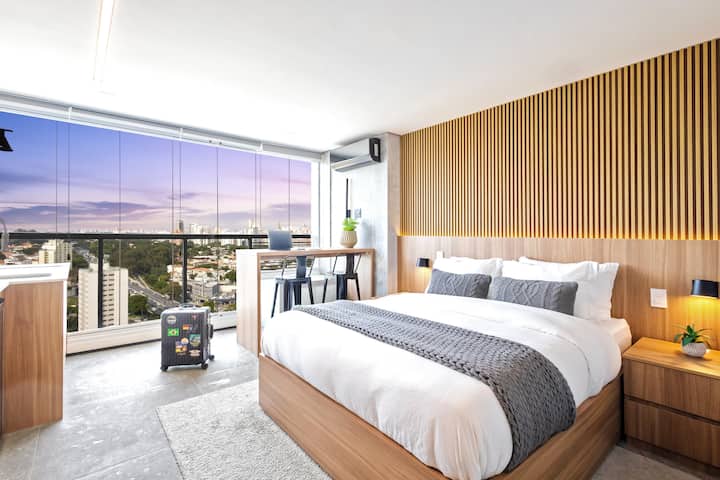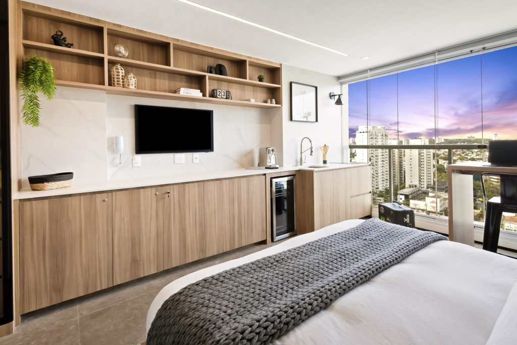 Warm wood, soft neutrals, and floor-to-ceiling windows that turn the São Paulo skyline into a living backdrop. Hotel-grade linens and thoughtful kitchen conveniences create the calm of a private residence, served with the care of a curated stay.
